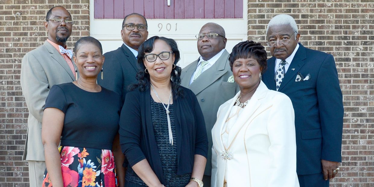 (back row l-r) Dea. Kermit Johnson, Jackie Bomar, Rev. Robert Robinson, Dea. Andrew Mims, Sr. (front row l-r) Hope Johnson, Deborah Evans, First Lady Melva Bruton; Florena Miller, Dr. Kenneth Peake, Gwen Adamson (not pictured)